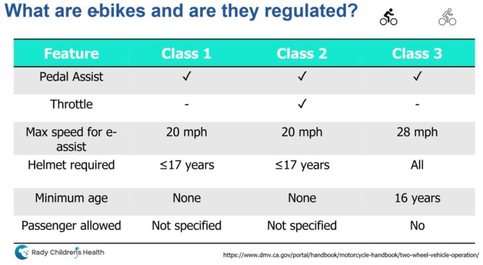 Rady Children’s is involved intrying to help parents understand what type of e-bikes their children have and the top speeds, with current work underway to define e-bike types to help inform researchers what type of e-bike was involved in a crash, Dr. Goodman says.